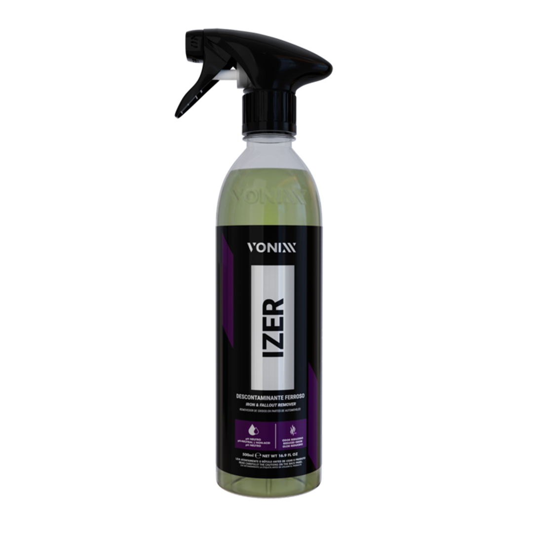 Izer es un descontaminante férrico de ph neutro que elimina el hollín de frenos oxidado de las ruedas, actúa para eliminar la oxidación del material ferroso de la pintura y otras partes externas del vehículo y ayuda a eliminar las manchas de óxido en las piezas cromadas. En el motor, ayuda a eliminar la oxidación de las piezas metálicas, dejándolo con un aspecto renovado. No se recomienda el uso del producto sobre superficies recubiertas de zinc.